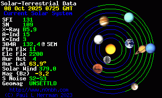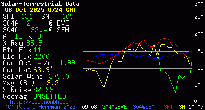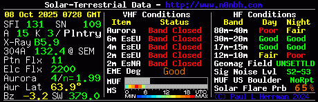 The greatest observed 3 hr Kp over the past 24 hours was 4 (below NOAA Scale levels). The greatest expected 3 hr Kp for Oct 08-Oct 10 2025 is 4.67 (NOAA Scale G1).