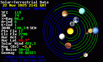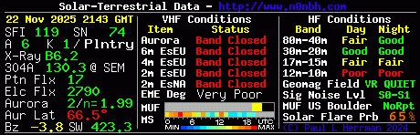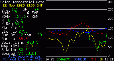 The greatest observed 3 hr Kp over the past 24 hours was 3 (below NOAA Scale levels). The greatest expected 3 hr Kp for Nov 22-Nov 24 2025 is 2.67 (below NOAA Scale levels).